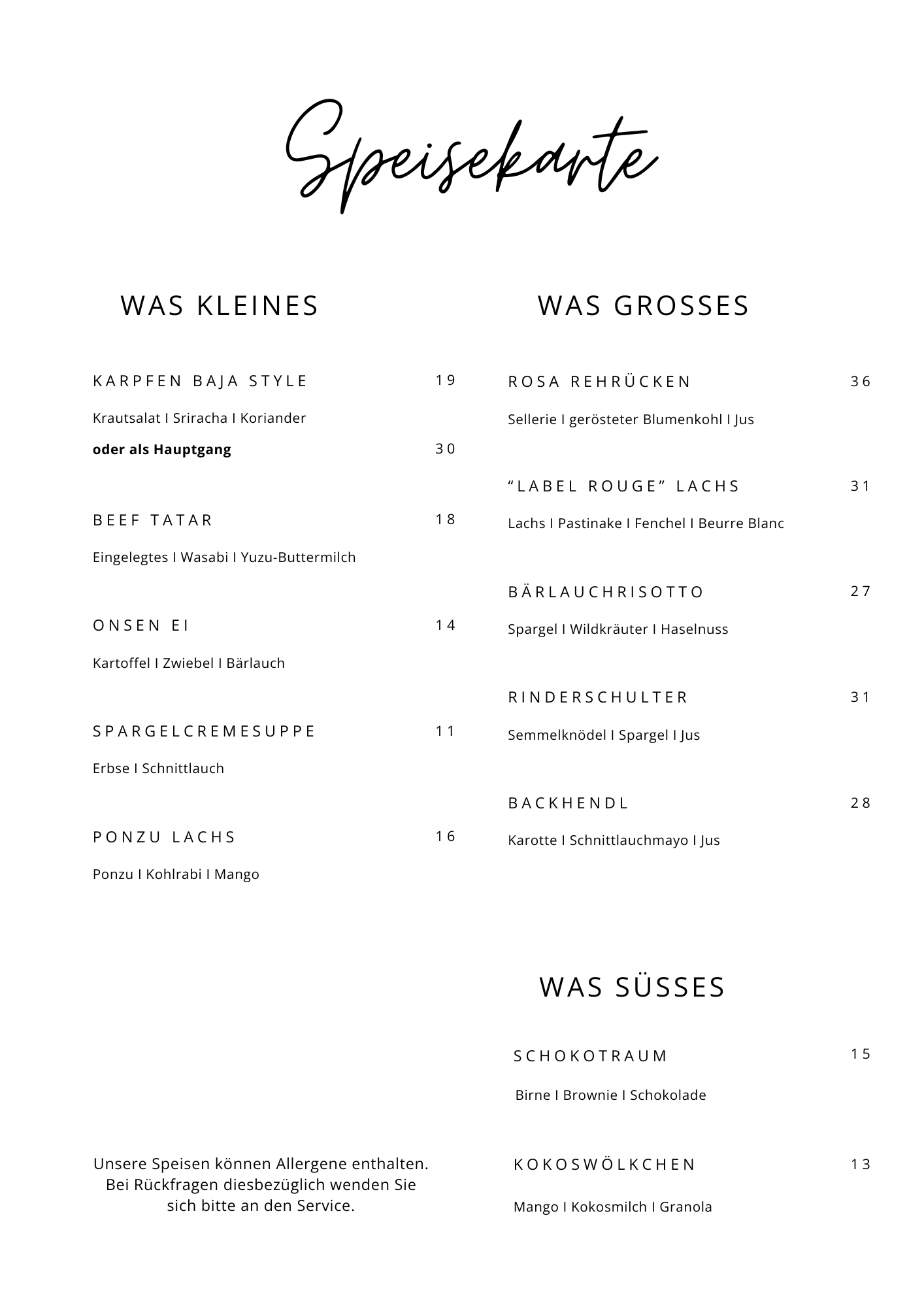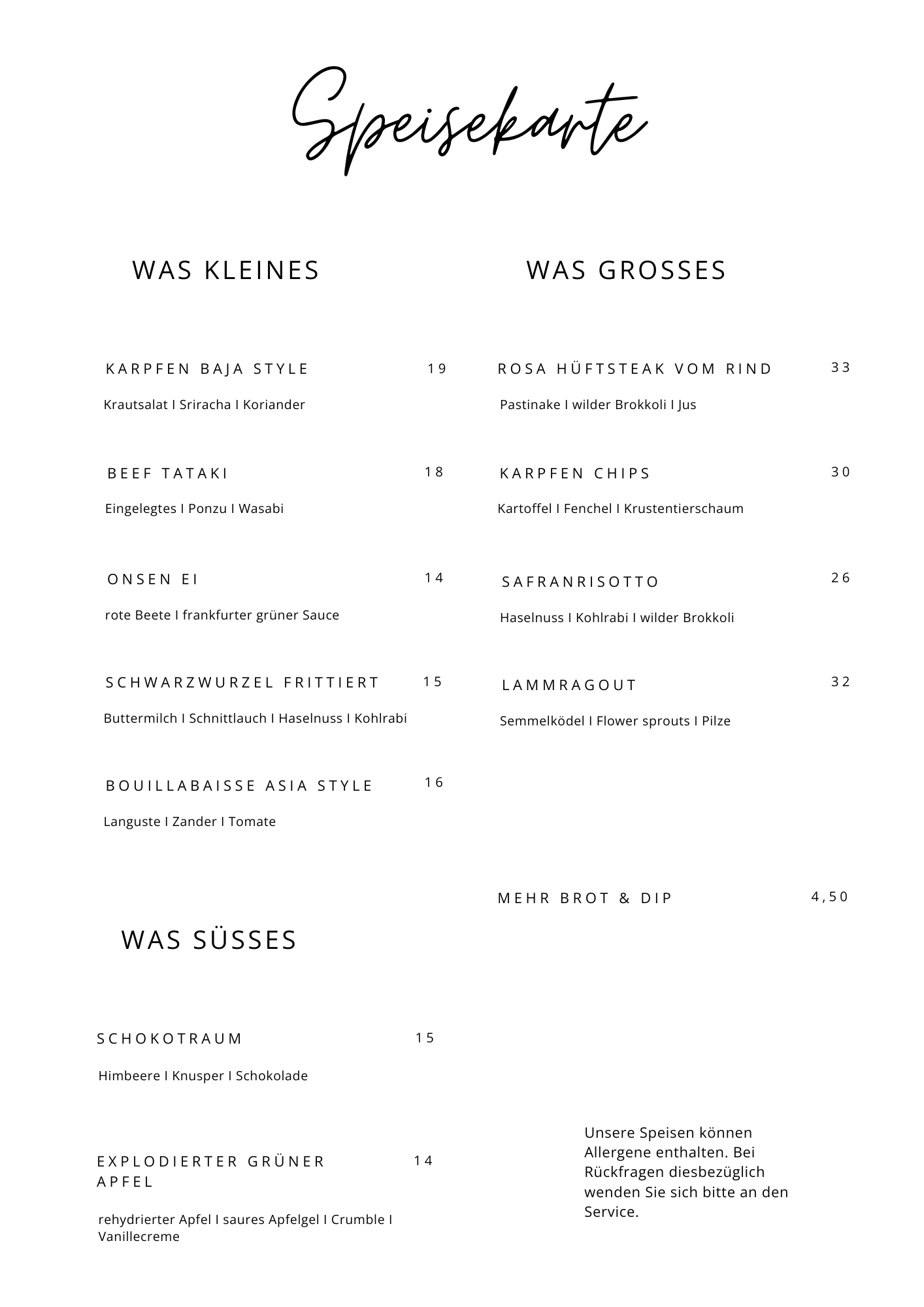 Bitte beachten Sie, dass sich unsere Speisekarte nach Verfügbarkeit und Frische unserer Produkte richtet und jederzeit Änderungen unterliegen kann.